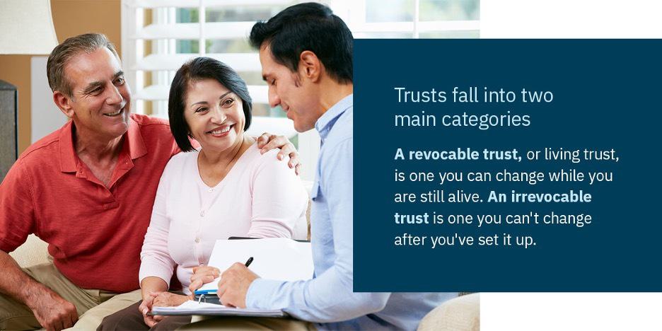 Generally speaking, trusts fall into two main categories—revocable or irrevocable. A revocable trust, or living trust, is one you can change while you are still alive. You can name yourself as the trustee of a revocable trust, as well, only passing on trustee duties to a third party after your death. The assets in a revocable trust bypass probate but might be subject to an estate tax.