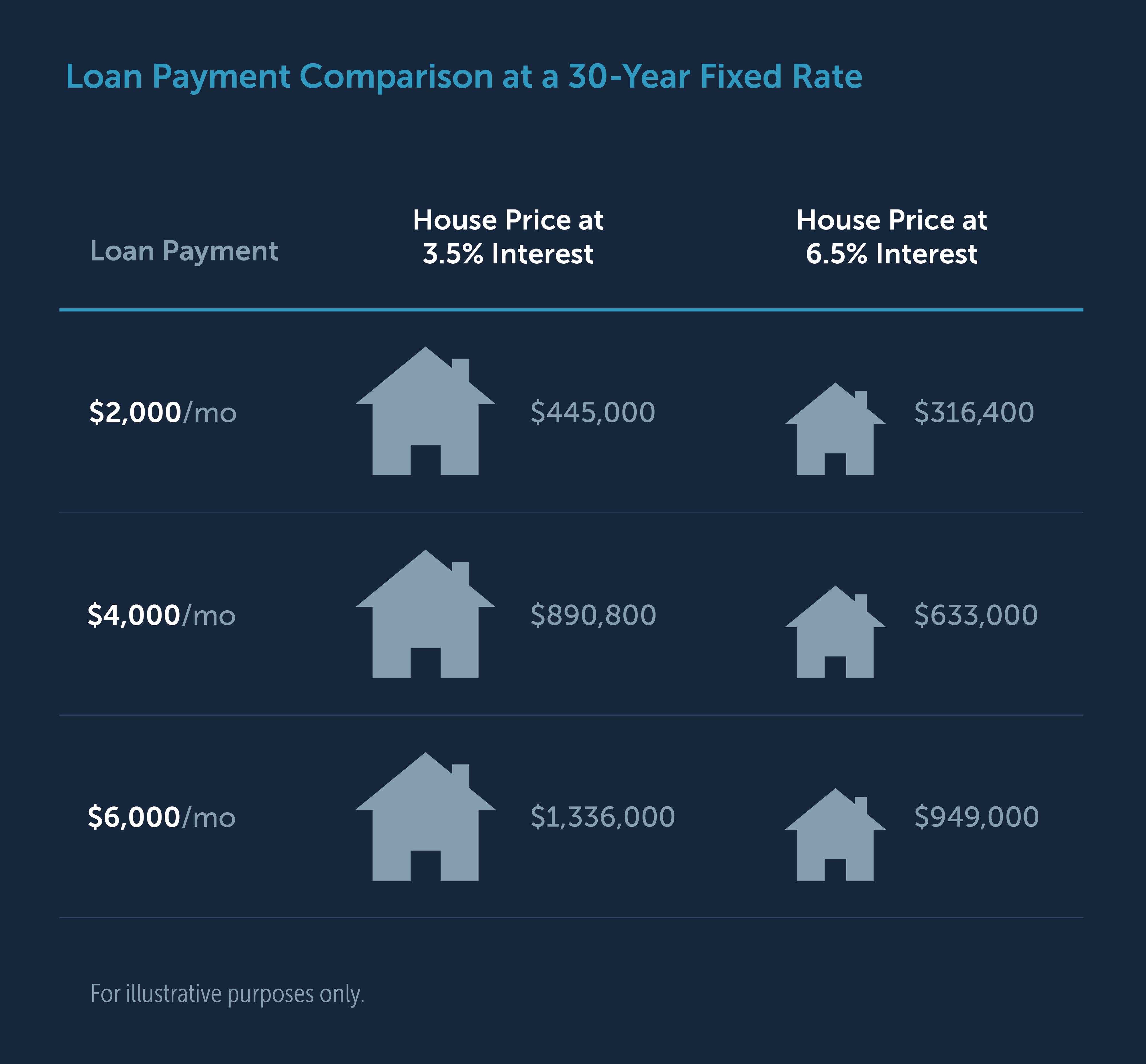 When budgeting using a specific monthly payment, a higher interest rate eats away at the price you can spend on a home because you’ll need to allocate more money each month toward interest, rather than the principal loan payment. The chart below illustrates the impact.