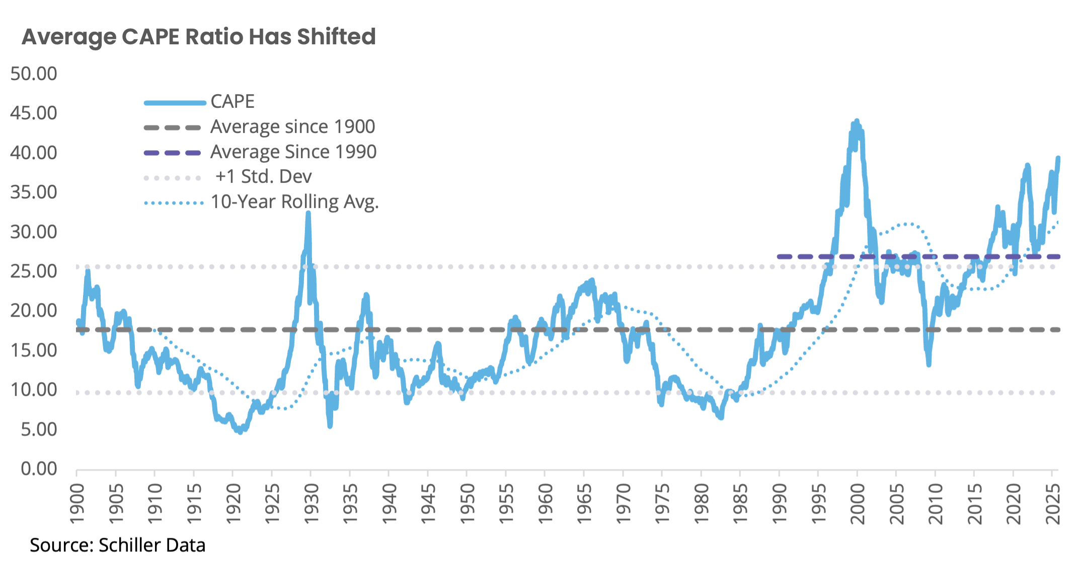 Valuations are high, but perhaps not as abnormal as investors fear. Market historians point to today’s cyclically adjusted price-to-earnings ratio (CAPE ratio—a measure of valuation that smooths out the temporary effects of economic cycles and short-term earnings volatility), which is at nearly 40x compared to a long-term average of about 18x since 1900.