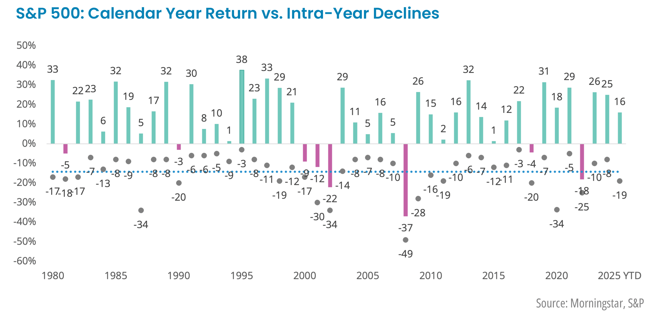 This does not mean that investors should not expect regular bouts of volatility. Throughout bull markets, high-profile prognosticators will commonly throw out the easiest of all market predictions: “The market will decline by 5%-15% over the next 1-2 years.” Why is this such an easy prediction? Because it’s almost always true. Since 1980, the market has experienced an average intra-year decline of about 14% each year, despite ending most years in positive territory.