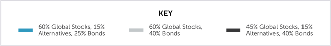 Index Composition information: 60% Global Stocks, 40% Bonds is composed of 36% U.S. Stocks, 18% International Stocks, 6% Emerging Market Stocks, and 40% Intermediate Government Bonds. 60% Global Stocks, 15% Alternatives, 25% Bonds is composed of 36% U.S. Stocks, 18% International Stocks, 6% Emerging Market Stocks, 15% Market Neutral, and 25% Intermediate Government Bonds. 45% Global Stocks, 15% Alternatives, 40% Bonds is composed of 27% U.S. Stocks, 13.5% International Stocks, 4.5% Emerging Market Stocks, 15% Market Neutral, and 40% Intermediate Government Bonds. U.S. Stock returns are represented by the total U.S. market return, from the Ken French Data Library. International Stocks are represented by the total developed international market, from the Ken French Data Library. Emerging Market Stock returns are represented by the total emerging market, from the Ken French Data Library. Market Neutral is represented by CISDM Equity Market Neutral Index, from Morningstar. Intermediate Government Bonds are represented by the Ibbotson Associates U.S. Intermediate Government Total Return Index from the Stocks, Bonds, Bills, and Inflation (SBBI) data, from Morningstar.