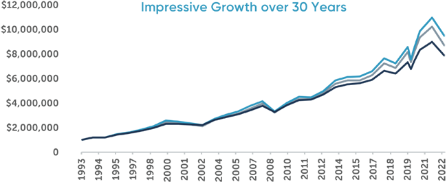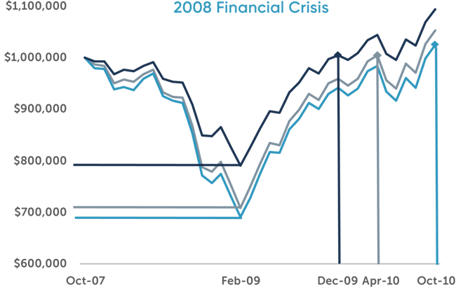 Chart sources: Ken French Data Library, Morningstar Direct. For illustrative purposes only. The first chart illustrates the hypothetical growth of $1 million over the 30-year period ending in December 2022, and the second chart illustrates the hypothetical performance of $1 million invested at the October 2007 market peak and held through the Great Financial Crisis.
