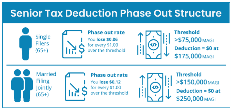The deduction, available for tax years 2025-2028, offers up to $12,000 if married filing jointly and $6,000 for all other filers. Unfortunately, the deduction has a low phaseout range of $150,000-$250,000 if married filing jointly and $75,000-$175,000 for all others.