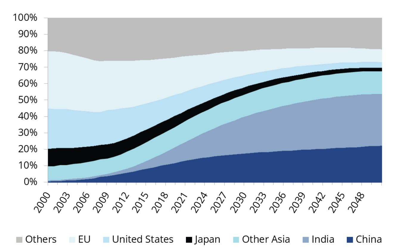 Chart 1, which depicts the growth of consumption by the middle class in Asia speaks for itself. By 2050, Asia (ex-Japan) will represent between 60% and 70% of the world’s middle class consumption. Surely, this has to be one of the most powerful long-term economic trends in the world today.